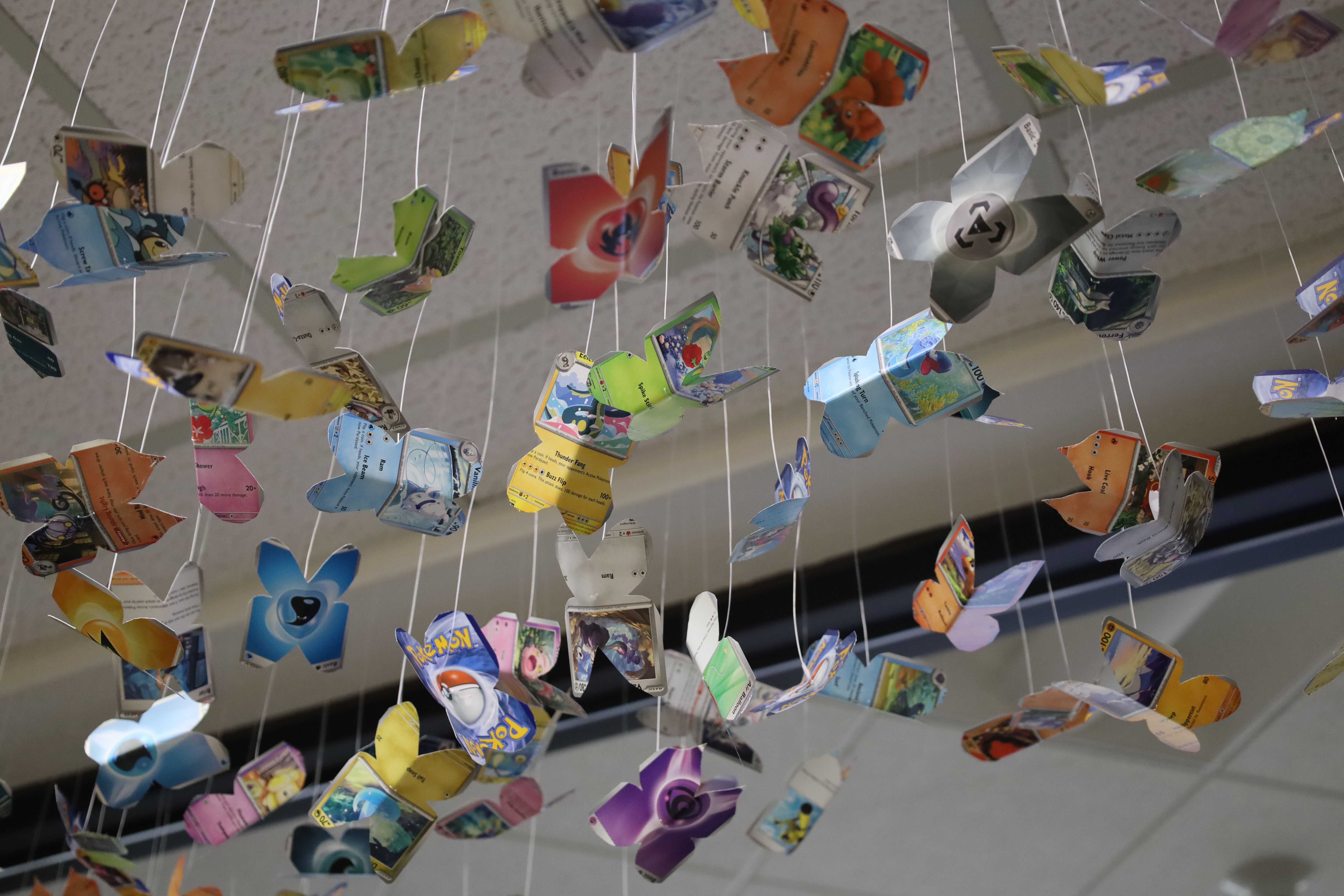 Another piece flutters overhead, above the main hallway doors.